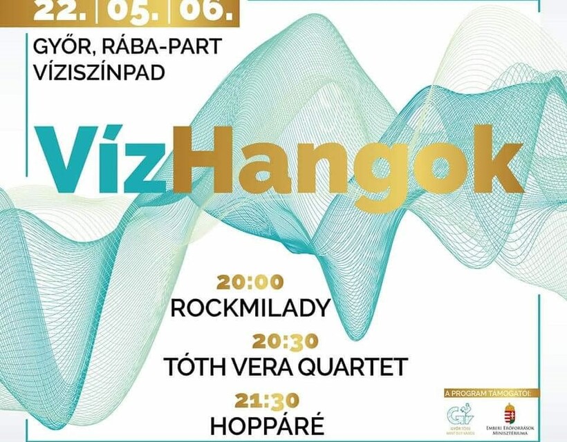 Május 6-án pénteken este 8 órakor órakor ingyenes VízHangok koncert RockMiladyvel, a Hoppáré zenekarral és Tóth Vera Quartettel. A helyszín a hagyományos víziszínpadé péntek este: Rába-part, a Petőfi híd és a Rába Kettős híd között.